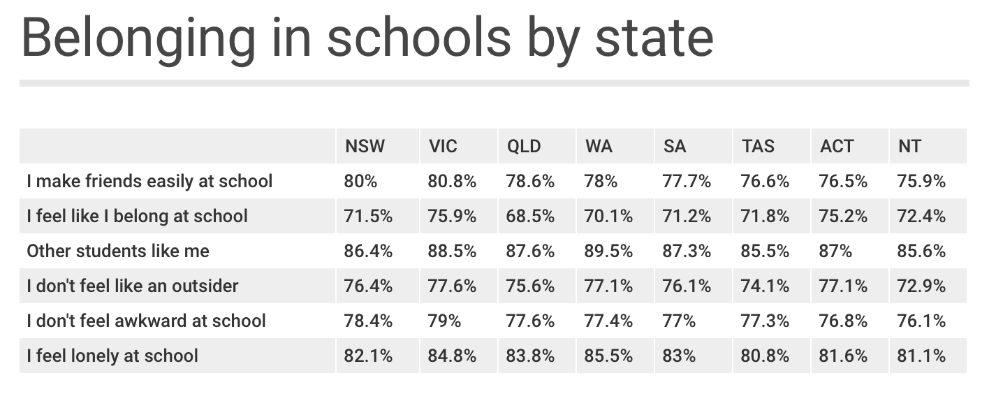 Nationally, 83.5 per cent disagreed with the statement "I feel lonely at school" and 71.9 per cent said they felt like they belonged.Belonging in school